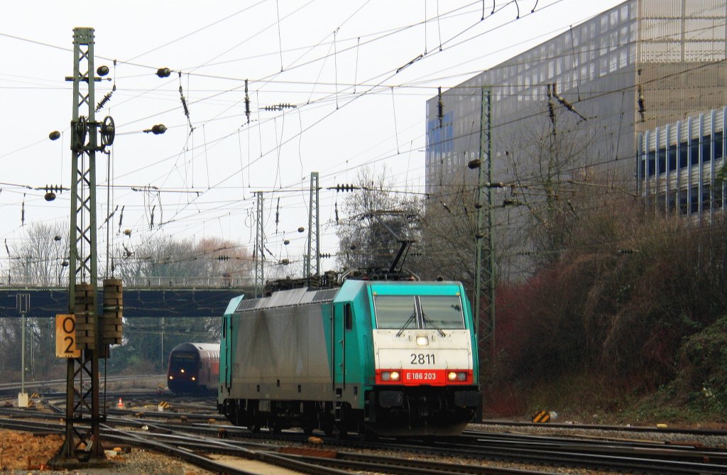 Die Cobra 2811 kommt als Lokzug aus Belgien und fährt in Aachen-West ein bei 6 Plus Grad am 16.2.2013.