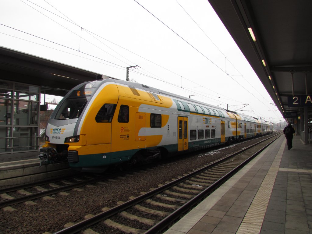 Die Odeg ET 445-103 am 15.02.2013 zum ersten mal im Bahnhof Schwerin HBF im regulären Fahrgastbetrieb auf dem RE 2