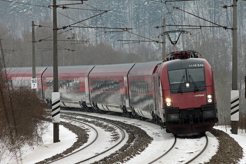 In wenigen Minuten wird die 1116 248 mit Railjet 652 (Graz - Wien Meidling) am 15.02.2013 ihren nächsten Anhaltebahnhof Bruck/Mur erreichen.