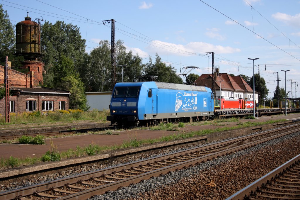 Mit einem GZ am Haken kam die 145 030-7 "Rasender Roland" von der Pressnitztalbahn am 12.08.2012 durch Großkorbetha