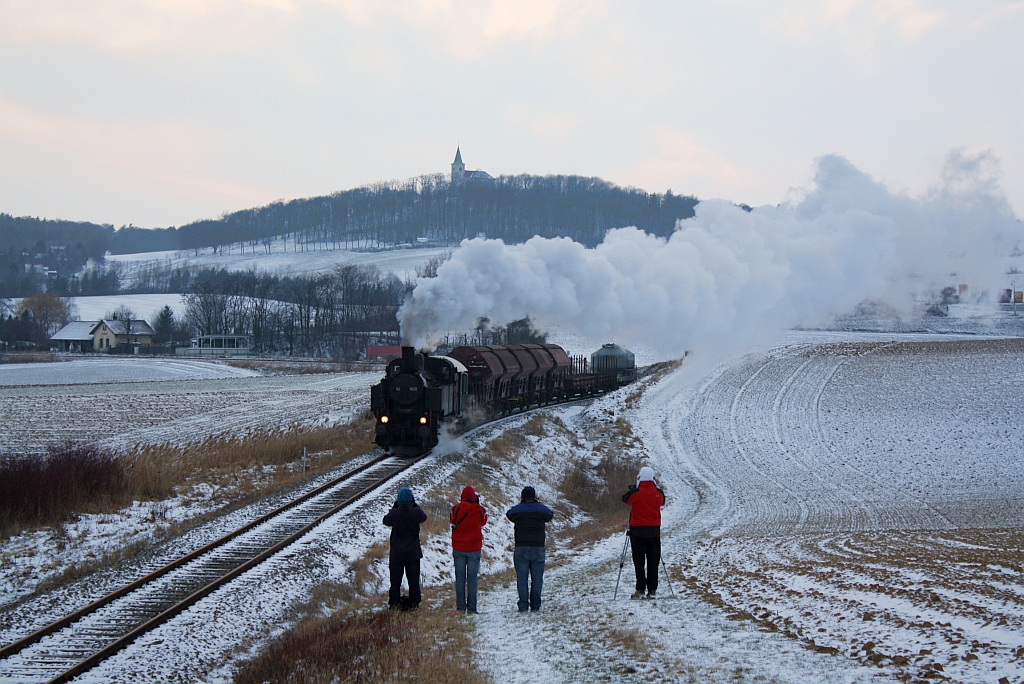 Vorbildlich in einer Reihe fotografieren die Kollegen die NLB 93.1420 als diese als Nebenfahrt SGAG 14500 am 11.Februar 2013 die Hst. Karnabrunn verlassen hat.