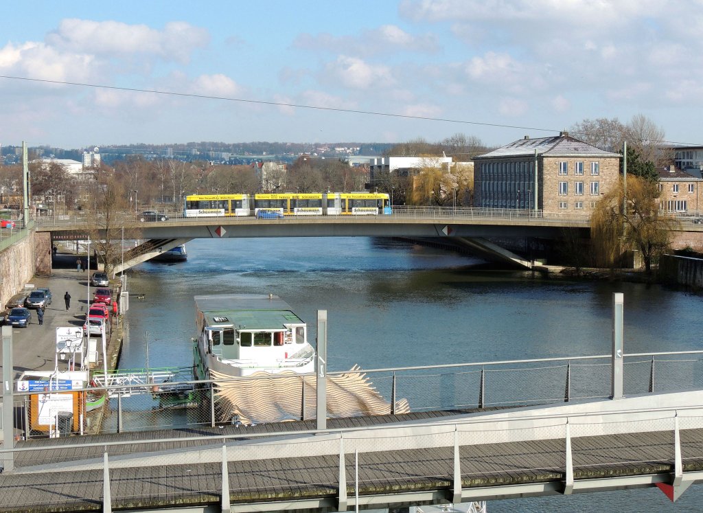 Regiotram überquert die Fulle in Richtung Leipziger Strasse, noch befinden sich die Schiffe im Winterschlaf (10.2.2013).