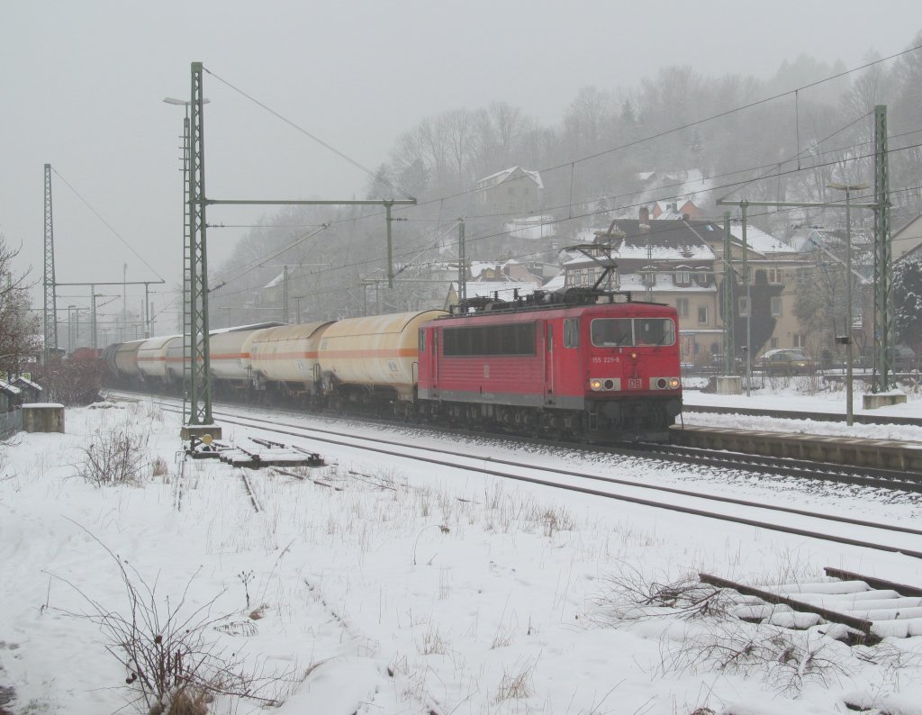 155 229-8 zieht am 16. Februar 2013 einen gemischten Güterzug durch Kronach.