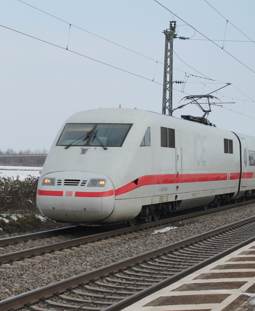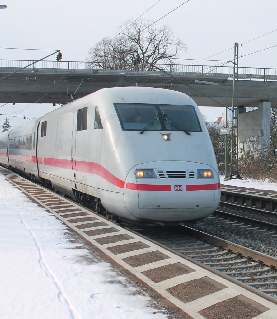 Beim Verlassen des Bahnhofes begegnete der Güterzug noch diesem in Richtung Norden einfahrenden ICE1 (16.2.2013).