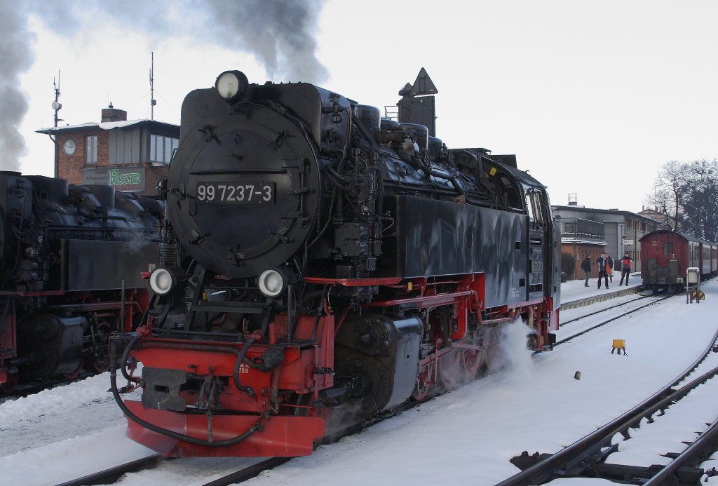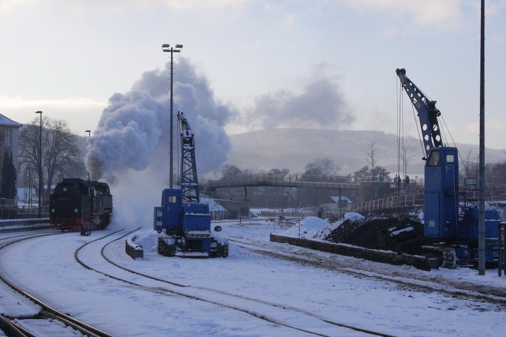 Wie man hier schön sehen kann, hat der Heizer von 99 7237, welche ihren Zug P8957 gleich zum Brocken bringen wird, für die kommende anstrengende Fahrt noch ein paar Kohlen draufgelegt!! (Aufnahme vom 25.01.2013 im Bahnhof Wernigerode)
