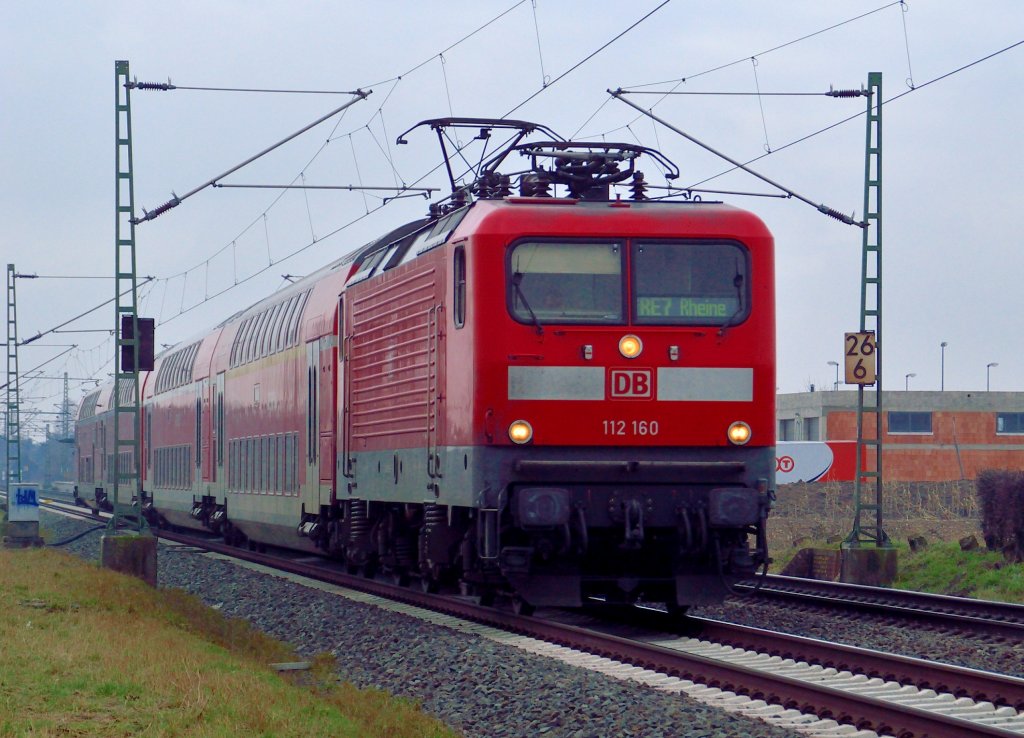 Auch der von der 112 160 gezogene RE7 Zug fährt nach Rheine, hier ist der Zug bei Allerheiligen zu sehen am Samstag den 16.2.2013