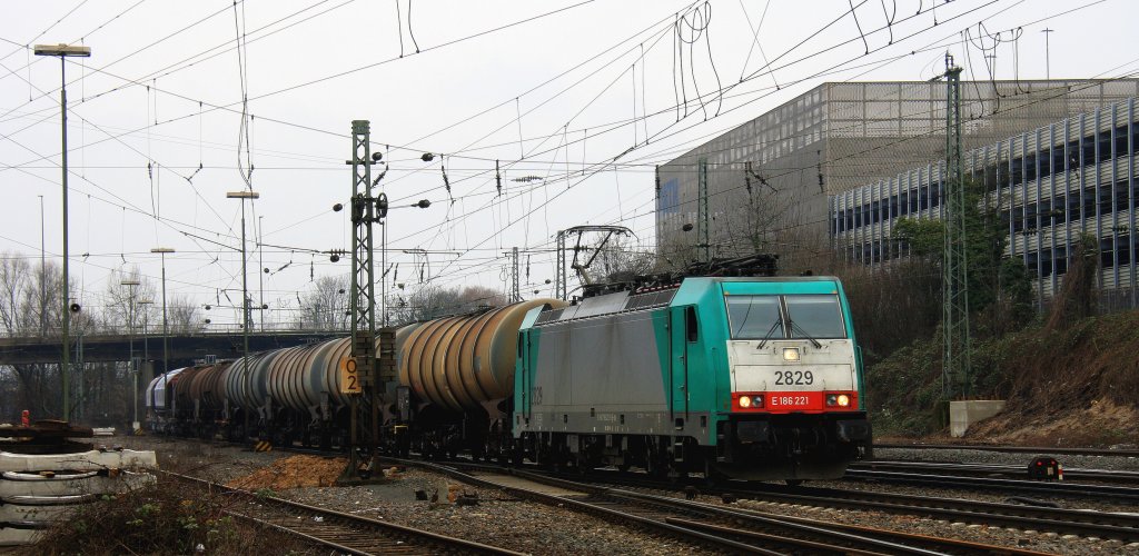 Die Cobra 2829 fährt mit einem langen gemischten Güterzug aus Antwerpen-Noord(B) nach Köln-Gremberg bei der Ausfahrt aus Aachen-West und fährt in Richtung Aachen-Hbf,Köln bei 6 Grad Plus am 16.2.2013.