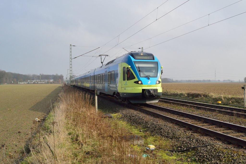 Gerade war die RB 33 nach Duisburg druchgefahren, als sich die Schranken erneut schlossen. Ich erwartete einen Güterzug und war reichlich erstaunt als die beiden Triebwagen ET 017 und 009 der Westfalenbahn kamen. Die Zielanzeigetafel gab zu erkennen das es sich um eine Testfahrt handele....nun spekuliere ich ob der Triebzug das Testobjekt ist oder aber ob man eine Leistungsübernahme auf der RE 11 getestet hat.....nun ja auf alle Fälle mal ein andres Farbschema als das Rot der Strecke am Niederrhein. Anrath den 17.2.2013