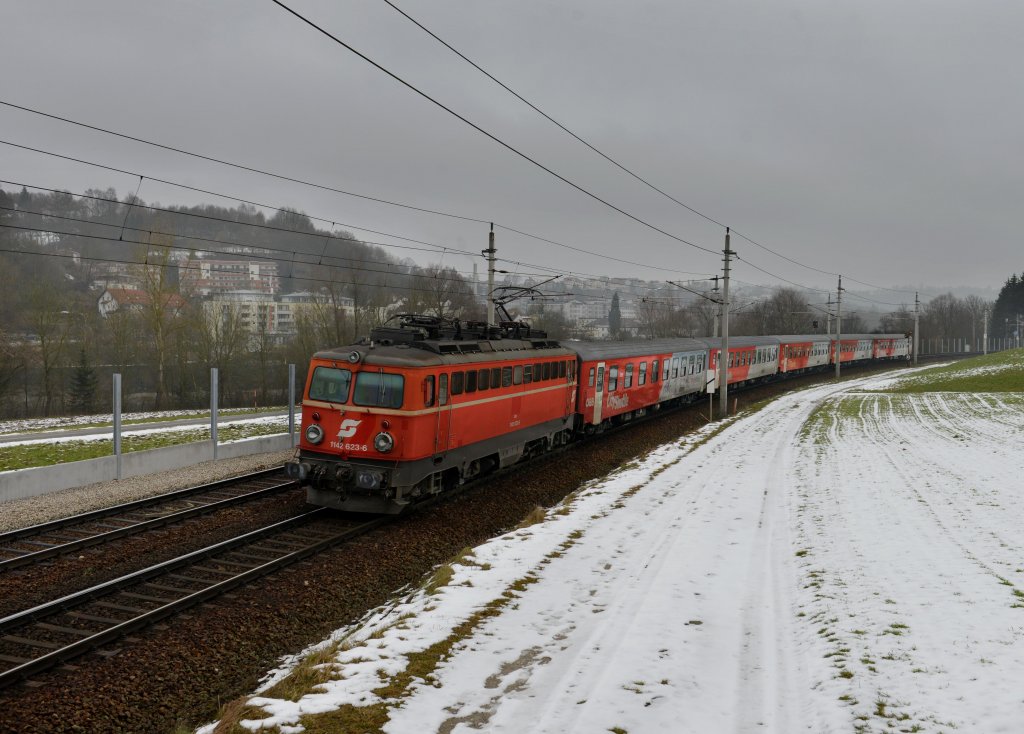1142 633 fährt am 19.02.2013 mit einem Erzleerwagenzug bei Niklasdorf Richtung Bruck/Mur.