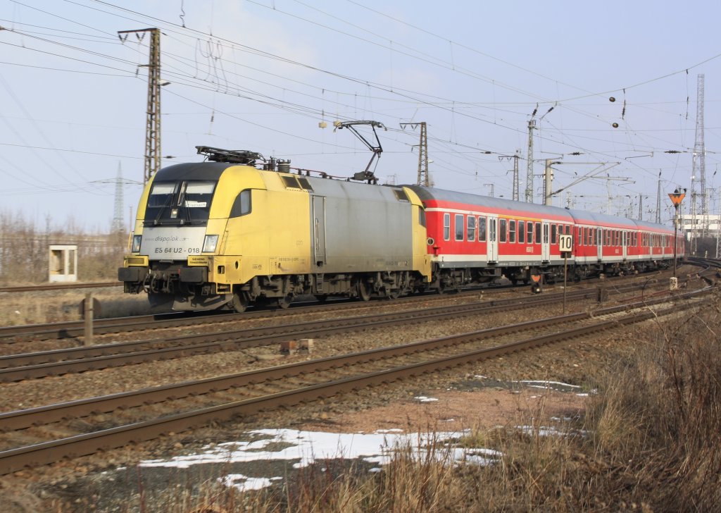 182 518-1 (ES 64 U2-018) verlässt am 15.02.2013 den Bahnhof Großkorbetha mit einem Regionalexpress die Saale hinauf.