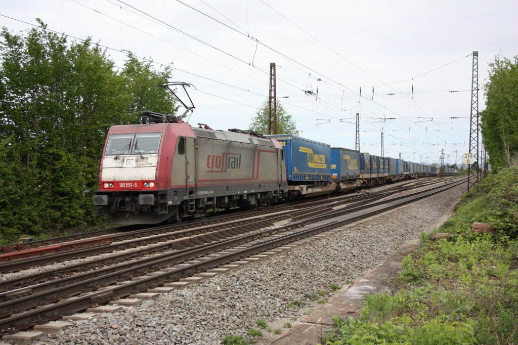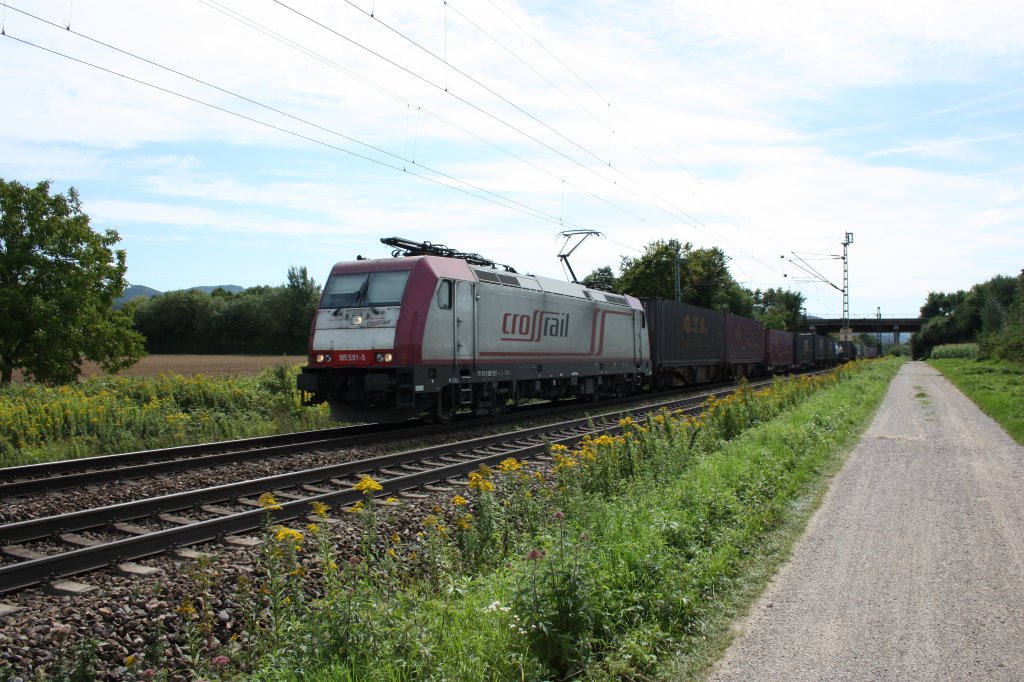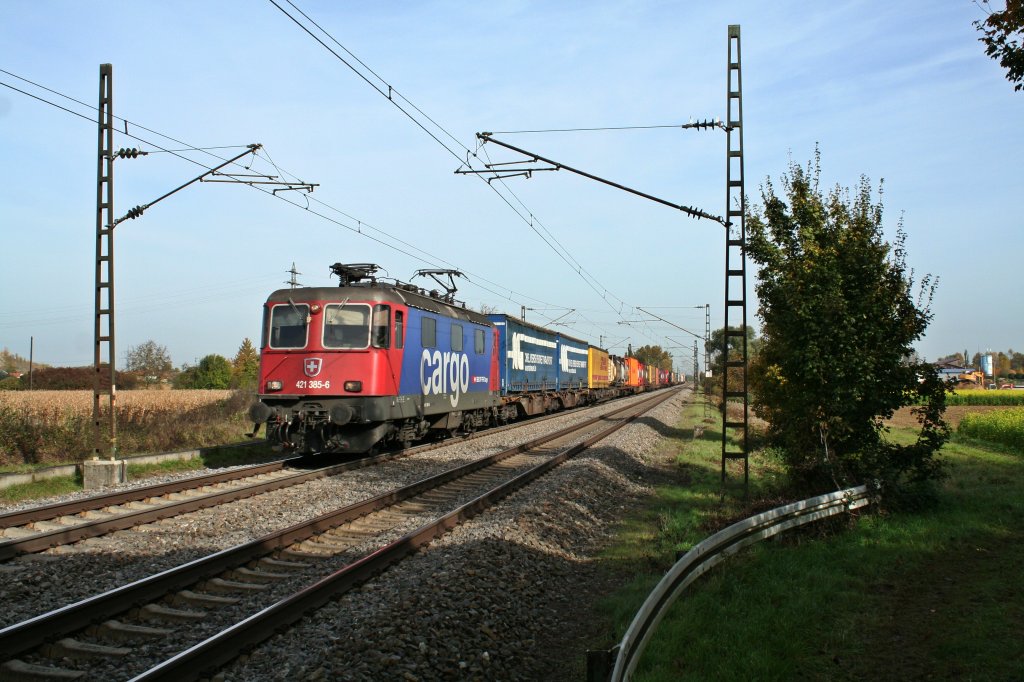 Re 421 385-6 war am 20.10.12 mit einem KLV-Zug Richtung Schweiz unterwegs. Aufgenommen wurde das Bild südlich von Buggingen.