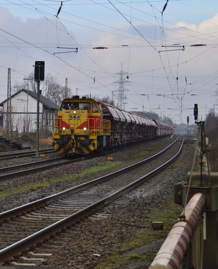 Am Sonntagnachmittag den 17.2.2013 kommt die EH 544 mit einem Selbstentladewagenzug nach Rohdenhaus durchgefahren.