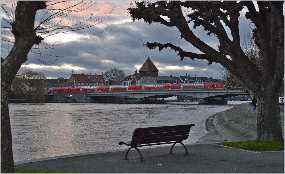 Auch der Zug der Schwarzwaldbahn will am Stefanstag 2012 nicht so recht weihnachtlich wirken. Blick von der Seestraße Richtung Altstadt/Niederburg in Konstanz.