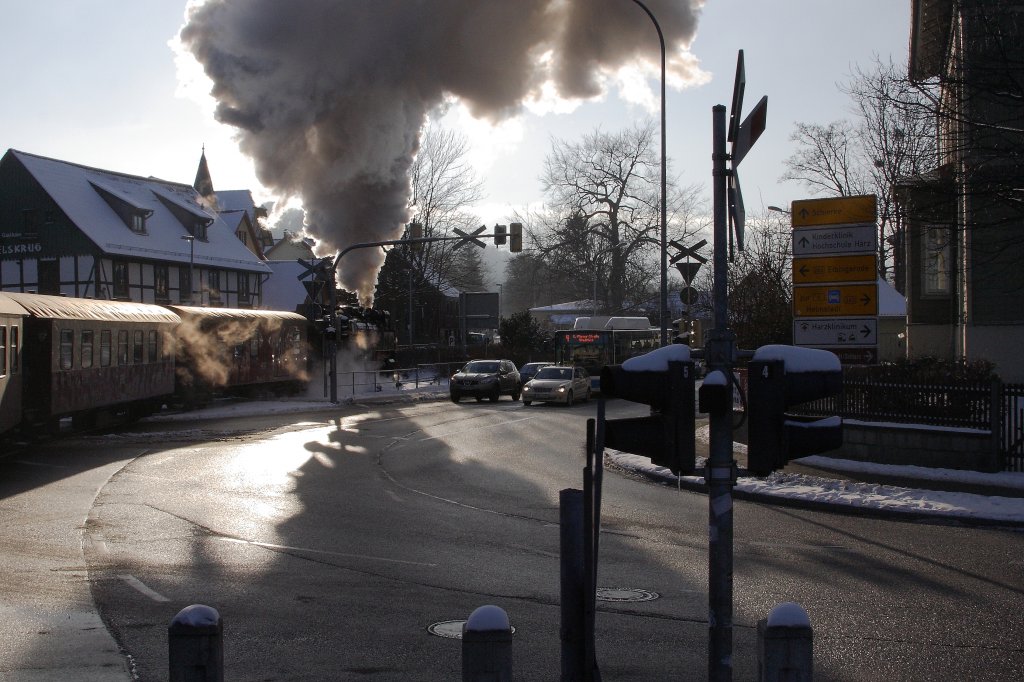 99 7237 hat mit ihrem Zug P8937 am 25.01.2013 soeben den Bahnhof Wernigerode-Westerntor verlassen und stampft jetzt der gleichnamigen Straßenkreuzung entgegen.