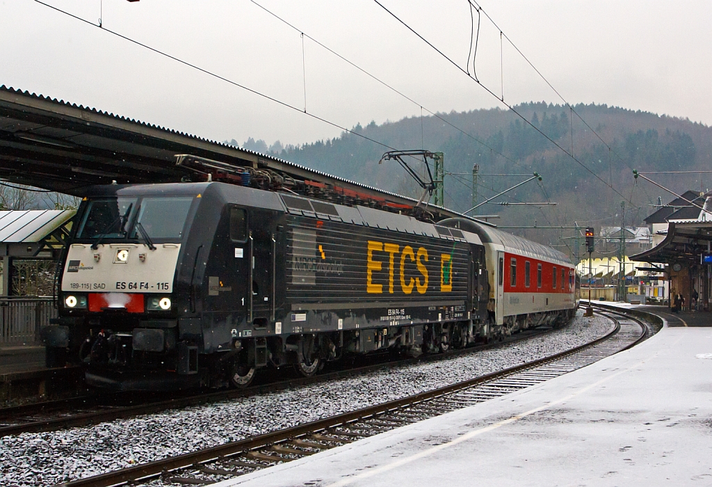 Die MRCE-Dispolok 189 115-9 (ES 64 F4 - 115) zieht, bei leichten Schneefall, den DB-Autozug AZ 1339 am 19.02.2013 durch den Bahnhof Betzdorf/Sieg in Richtung Rhein.