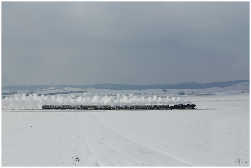 Die Strasshofer Dampflok 52.100, dampft mit dem Majestic Imperator, als Sonderzug 14370 von Korneuburg nach Ernstbrunn durch das winterliche Weinviertel. Wetzleinsdorf 17.2.2013