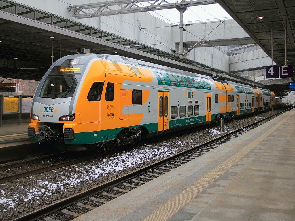 ODEG KISS 445 109 steht am 09.02.2013 als 37308 im Bahnhof Ludwigsfelde zur Abfahrt, nach Rathenow, bereit, aus privaten Gründen hatte ich allerdings kurz RE2 nach Wittenberge geschildert