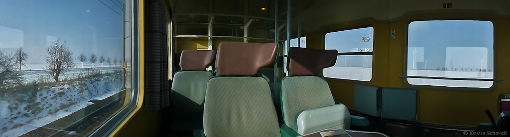 Panorama-Inneneinrichtungsaufnahme in einem ehemaligen InterRegio-Steuerwagen der Bauart Bimdzf, IC 2430 am 17.02.2013.