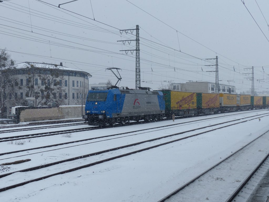 101 127 mit einen IC am Haken überholt TXL 185 513. München-Pasing 15.02.2013.