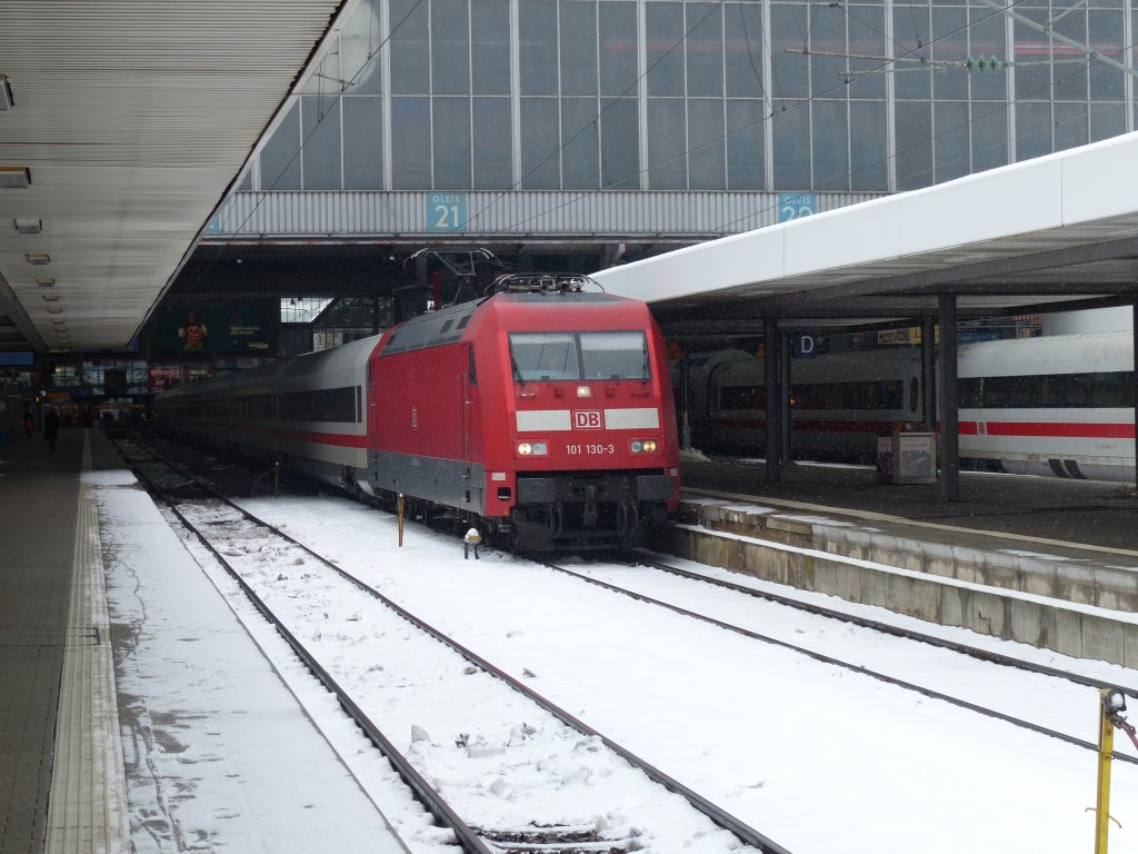 101 130 mit einen IC am Haken wartet am 15.02.2013 auf dem Münchener Hauptbahnhof auf die Abfahrt.