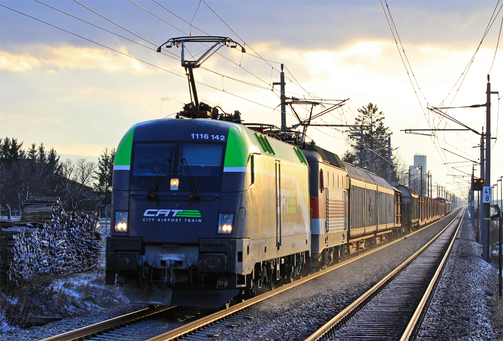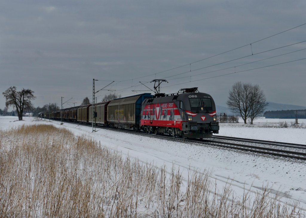 Nach einem kurzen Schneeschauer durchfahren am 20.02.13 die 1116.142 CAT und 1144.268 mit Gz 55050 (Vb-Ze) die Hst.Unter-Eggendorf.