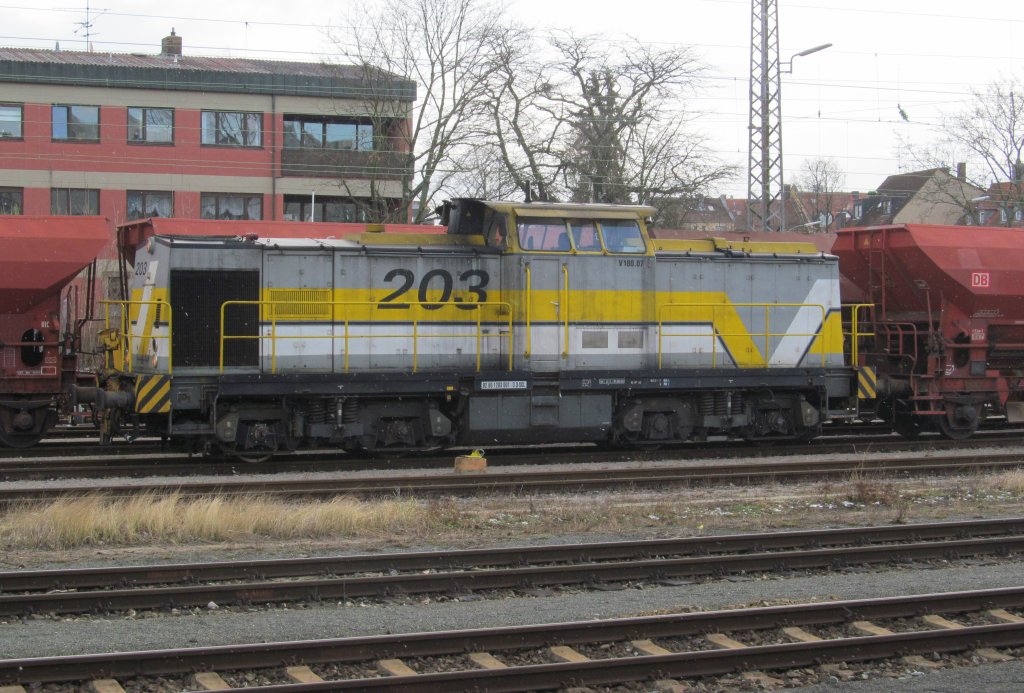 203 001-3 der SGL rangiert am 20. Februar 2013 mit einem Schotterzug in Bamberg.