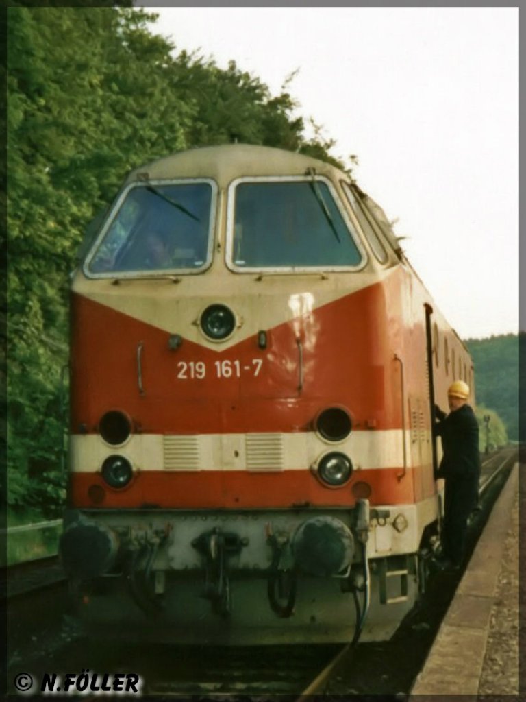 219 023 verlässt den Lauschensteintunnel auf der Fahrt zum Bahnhof Lauscha am 25.4. 1992
