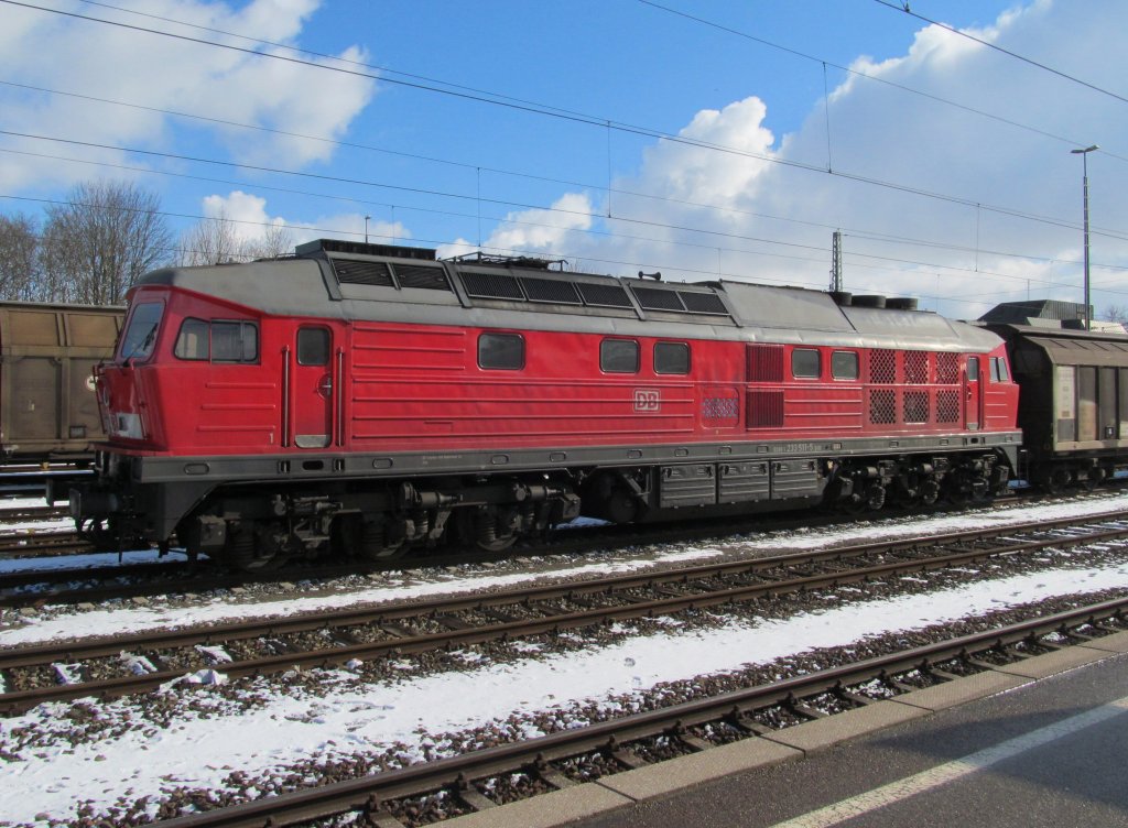233 511-1 steht am 20. Februar 2013 mit einem gemischten Güterzug im Bahnhof Crailsheim und wartet auf die Ausfahrt in Richtung Lauda.