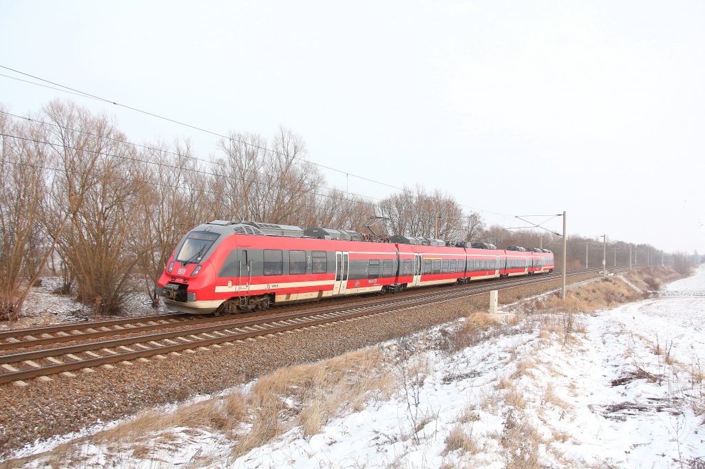 Am 10.02.13 durchfährt 442 116/616 mit einem weiteren 442 als RE 17068 "SAXONIA" den Ort Bornitz und wird in wenigen Minuten den Bahnhof Oschatz erreichen.
