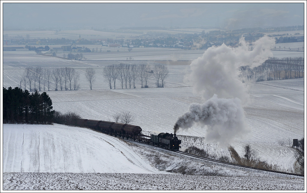 Die Strasshofer Dampflok 52.100, dampft mit dem Majestic Imperator, als Sonderzug 14370 von Korneuburg nach Ernstbrunn durch das winterliche Weinviertel. Hetzmannsdorf 17.2.2013
