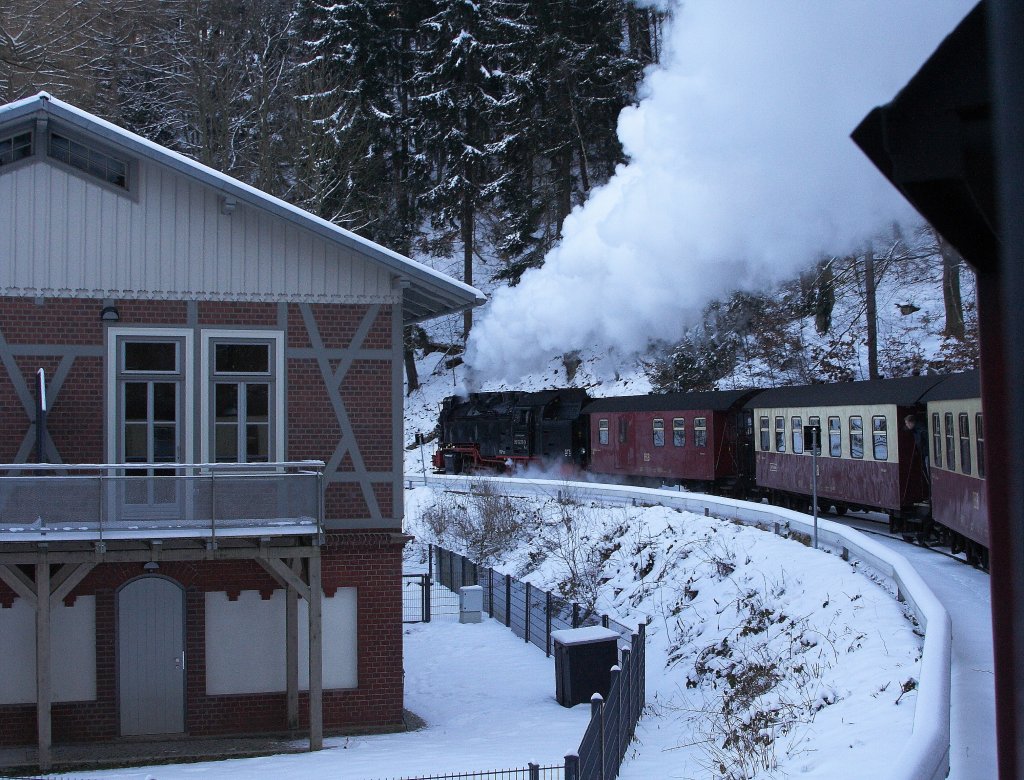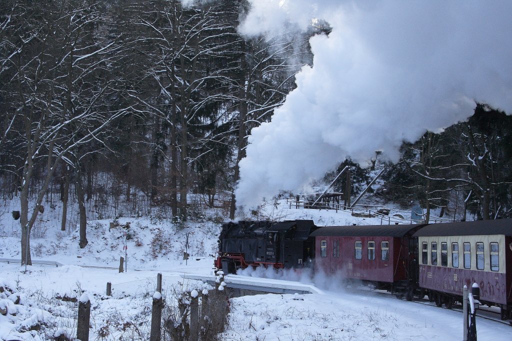 99 7237 mit P8937 in Richtung Brocken am 25.01.2013 kurz vor Erreichen der Haltepunktes "Steinerne Renne". Hier beginnt die Steigung nach Drei Annen Hohne und in den Oberharz, wobei auch der einzige Tunnel der Harzer Schmalspurbahnen durchquert wird. Zahlreiche Sandhäufchen an den Schienen zeugen davon, wie schwer das Anfahren an dieser starken Steigung ist. Hier ist vom Lokführer wirklich absolutes Fingerspitzengefühl am Regler gefragt. Der Klang der Auspuffschläge der anfahrenden Lok ist an dieser Stelle übrigens jedesmal genial! Ein regelrechtes Brüllen, welches durch den Wald schallt und von den umliegenden Berghängen vielfach widergegeben wird! Das muß man einfach gehört haben! Im links zu sehenden Gebäude befindet sich ein kleines Wasserkraftwerk.