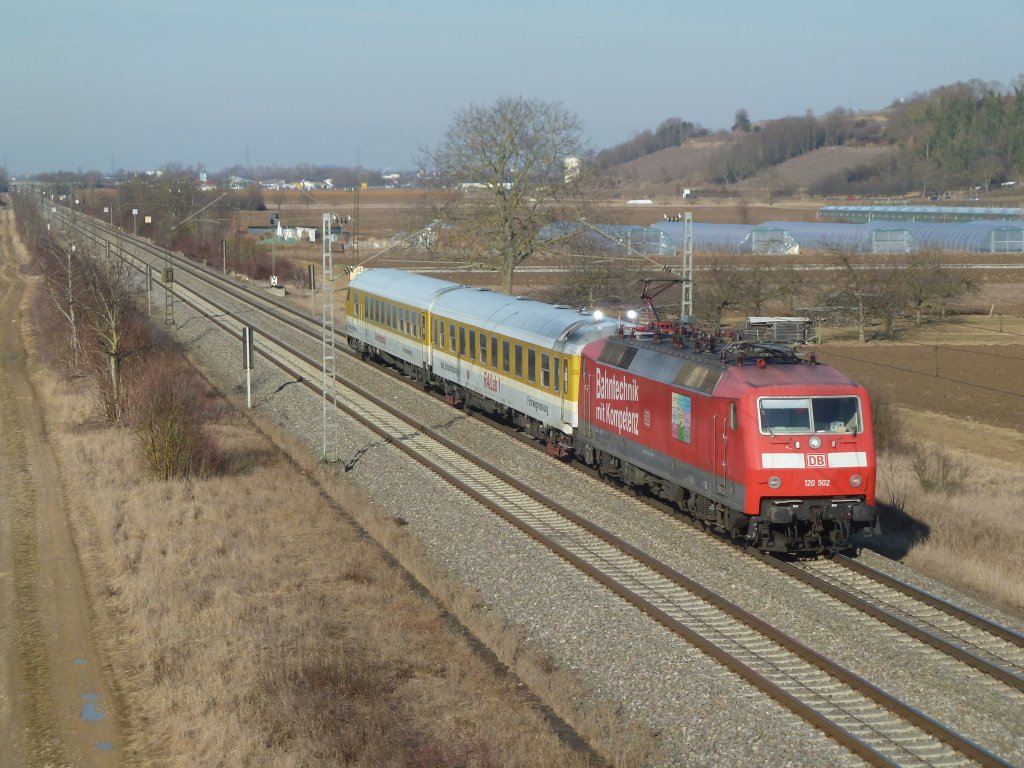 Am 21.02.12 war 120 502 (ex. 120 160-7) mit einem Messzug im Badnerland unterwegs. Hier ist sie auf der Rückfahrt gen Norden in Hügelheim zu sehen.