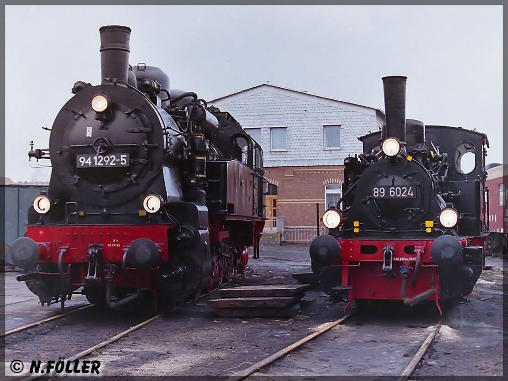 Am frühen Morgen des 25.2.1994 warten 94 1292 und 89 6024 auf die Aufgaben des Tages.