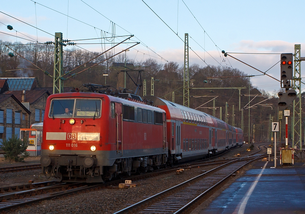 Auch 111er fahren noch an der Sieg - Hier fährt 111 016-2 mit DoSto´s als RE 9 - rsx Rhein-Sieg-Express (Aachen - Köln - Siegen) am 20.02.2013 in den Bahnhof Betzdorf/Sieg ein.
