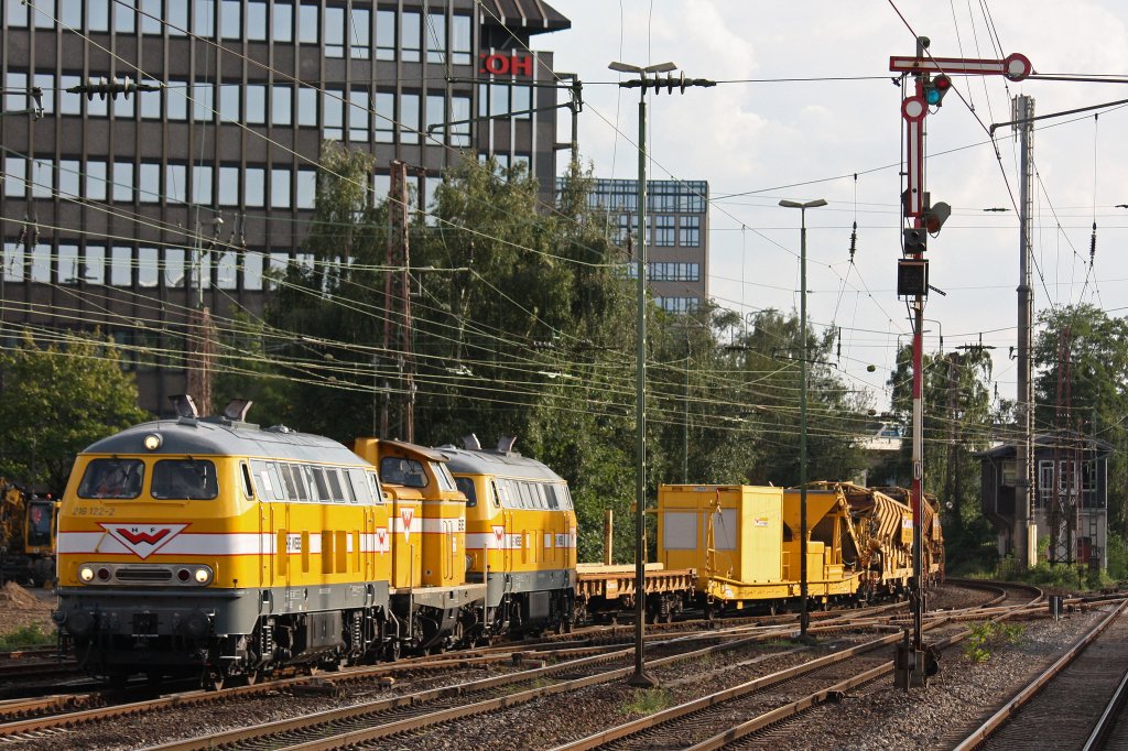 H.F.Wiebe 216 122 (Wiebe Lok 10)+211 045 (Wiebe Lok 9)+216 012 (Wiebe Lok 11) am 29.8.12 mit einem Bauzug bei der Einfahrt in den Gbf von Düsseldorf-Rath.Die Loks holten dort noch einen Kran ab und fuhren später weiter in Richtung Duisburg.