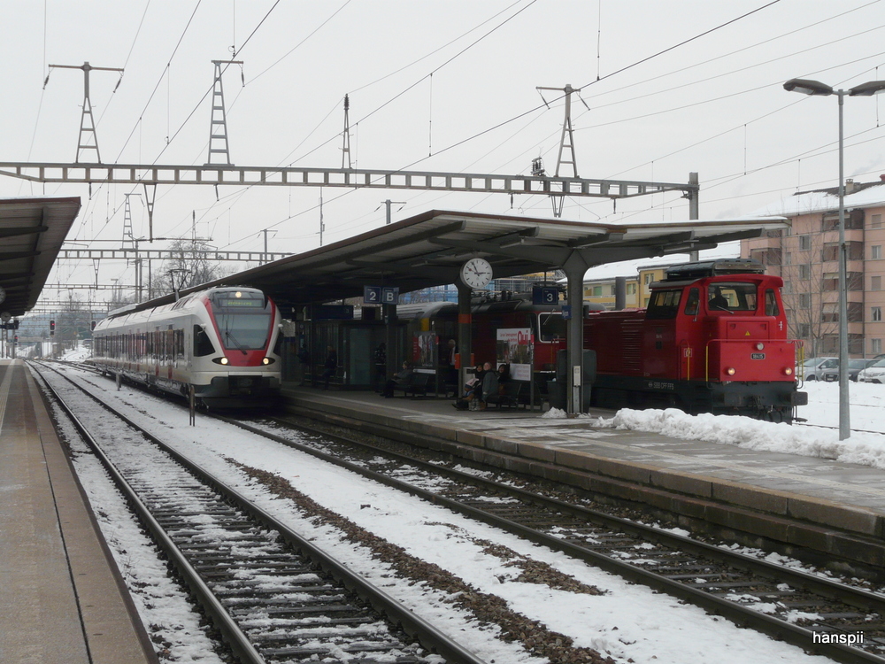 SBB - Triebzug RABe 523 ... als Dienstzug bei der durchfahrt im Bahnhof Nyon am 14.02.2013