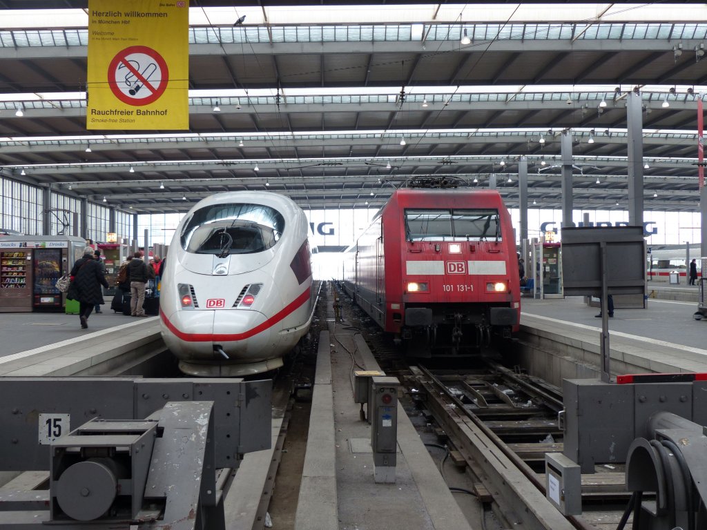 Während der ICE3 auf vdie Abfahrt wartet, ist 101 131 mit seinen IC gerade eingefahren.München(Hbf.)15.02.2013.