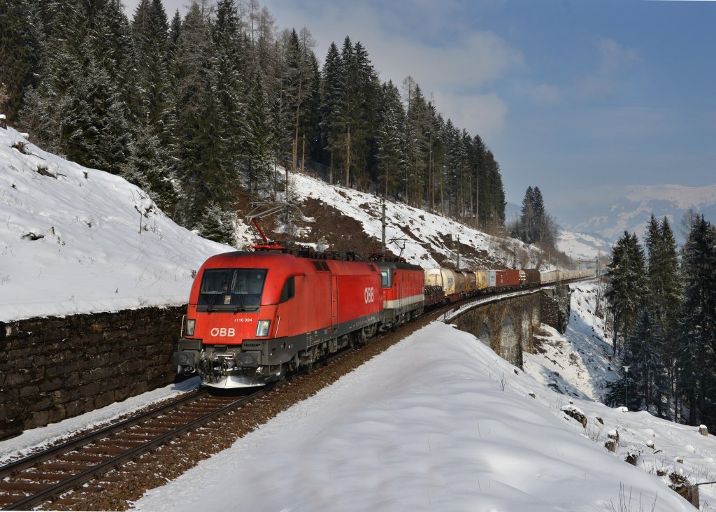 1144 087 mit einer Schwestermaschine mit einem Erzzug aus Eisenerz zwischen Hieflau und Admont, 06.09.2012