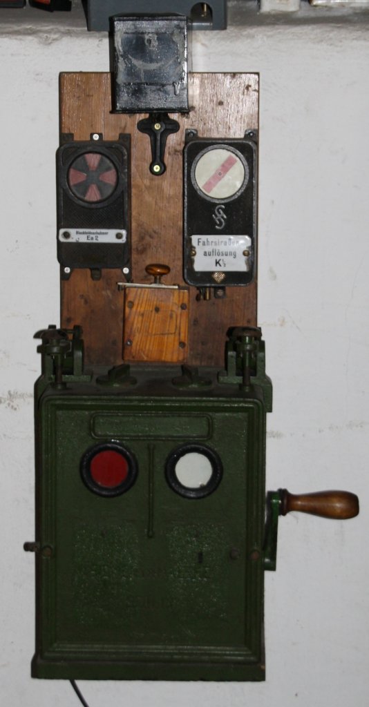 24.2.2013 Eisenbahnmuseum Letschin. Uraltes Blockwerk von Siemens und Halske mit Spiegelfeldern und Klingel / Glocke (oben)