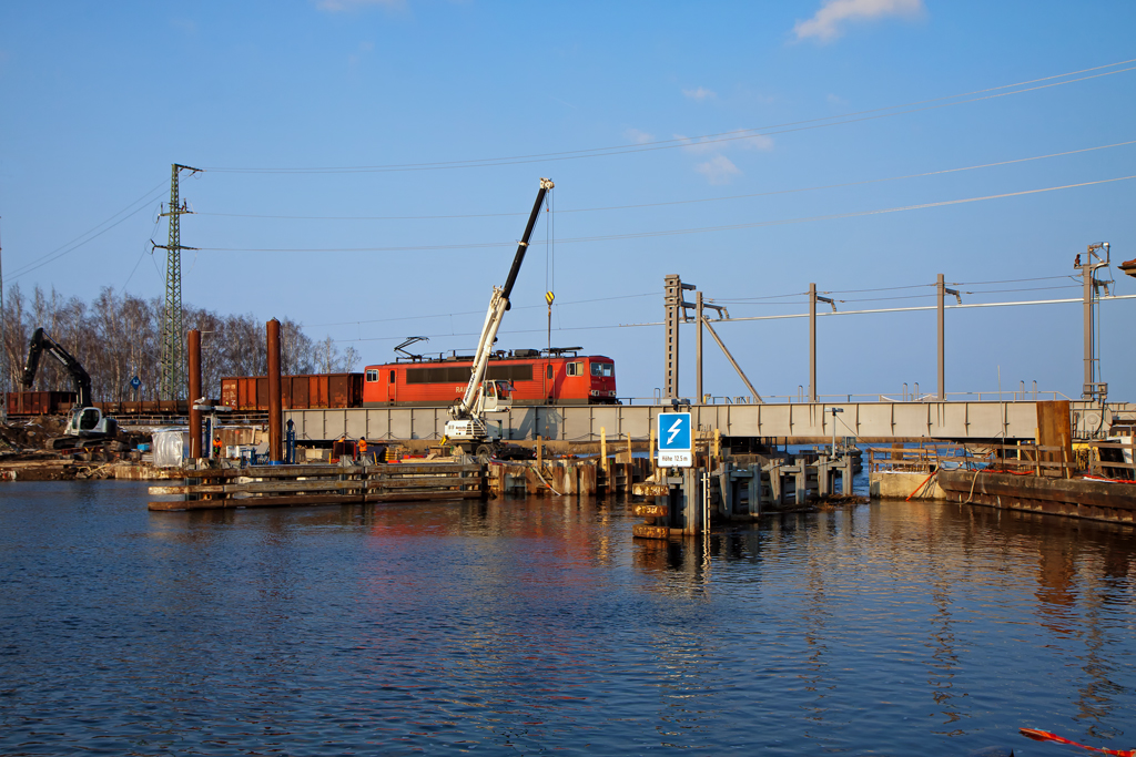 An der Peenebrücke in Anklam führt die Firma Hentschke umfangreiche Bauarbeiten durch, hier für den zweiten Brückentrog / Klappbrücke. Die Arbeiten ruhten als der Güterzug mit der Railion Logistics Lok 155 236-3 über die erste eingebaute Klappbrücke fuhr.