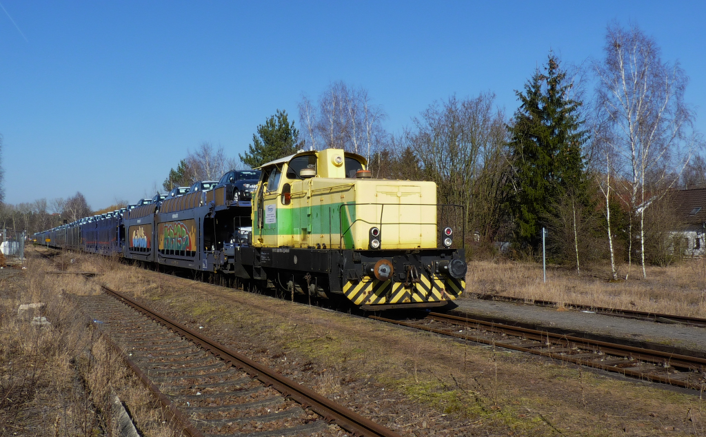 Muldental Eisenbahnverkehrsgesellschaft mbH 204 311-5 kommt mit Mosolf Autowagen aus Cuxhaven am 26.02.2013 bei der Durchfahrt im Bahnhof Stade.