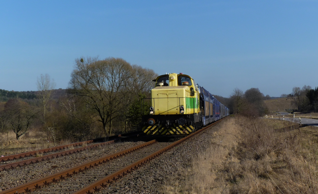 Auf der A 620 zwischen Fürstenhausen und Wehrden haben wir ihn entdeckt, den Autotransportzug nach Überherrn. Nachdem wir den Zug in Wadgassen auf den Chip gebannt haben, ging es weiter Richtung Überherrn. Standpunkt zwischen Differten und Linslerhof an der Landstraße.