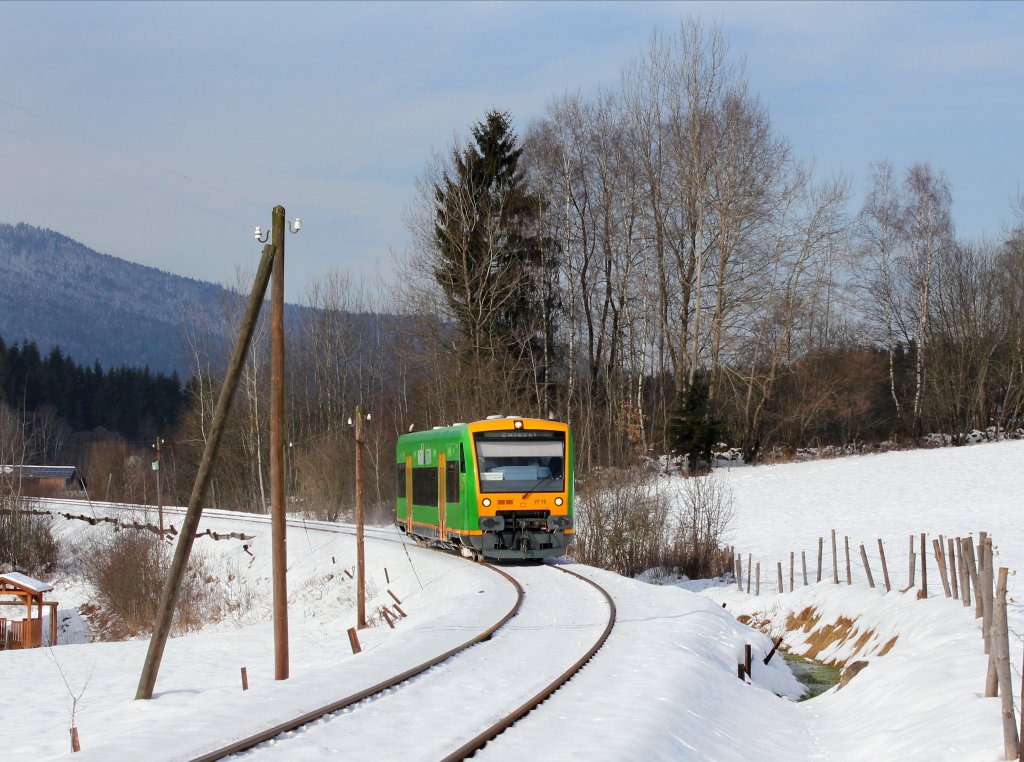 25.2.13 Neutrebbin. ODEG nach Berlin-Lichtenberg fährt an den Ausfahrsignalen des russischen EZMG-Stw in den Bahnhof ein. Kilometerstein und Telegraphenmasten sind auch noch vorhanden.