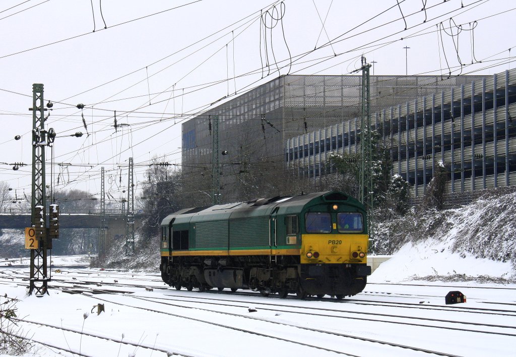 Die Class 66 PB20 von Railtraxx BVBA rangiert in Aachen-West bei starken Schneefall am Eiskalten 24.2.2013.