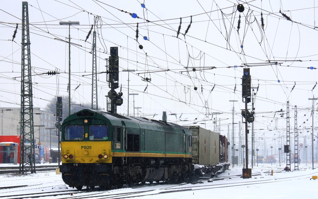 Die Class 66 PB20 von Railtraxx BVBA fährt mit einem langen Containerzug von Aachen-West nach Belgien bei Ausfahrt aus Aachen-West und fährt in Richtung Montzen/Belgien bei starken Schneefall am Eiskalten 24.2.2013.