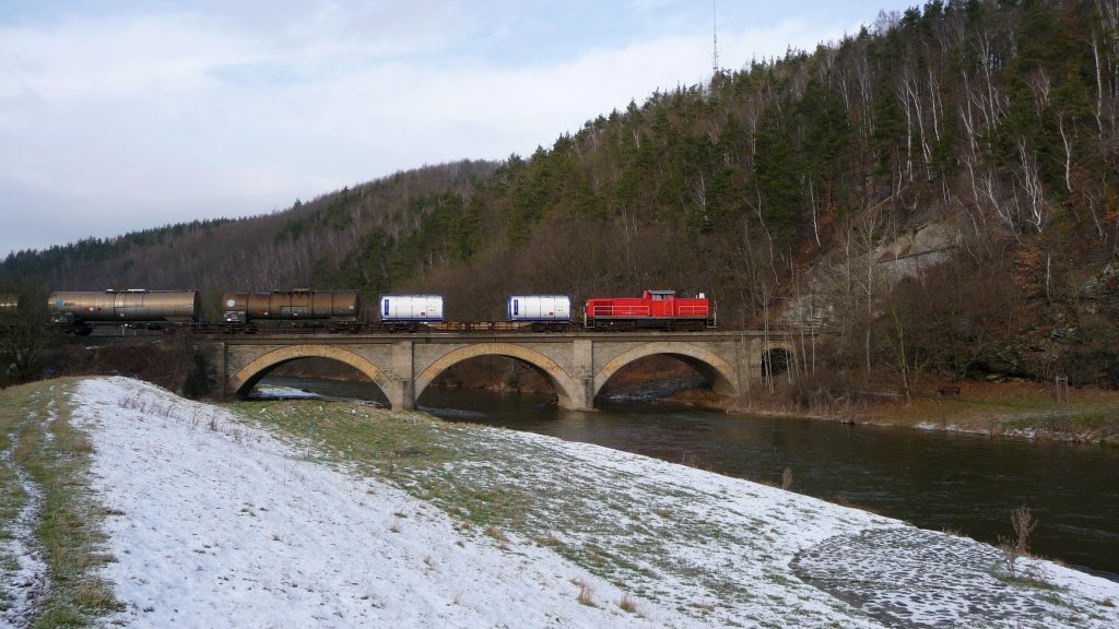 08.02.2013 BR 294 mit Kesselwagen auf der Elsterbrücke in Rothenthal.