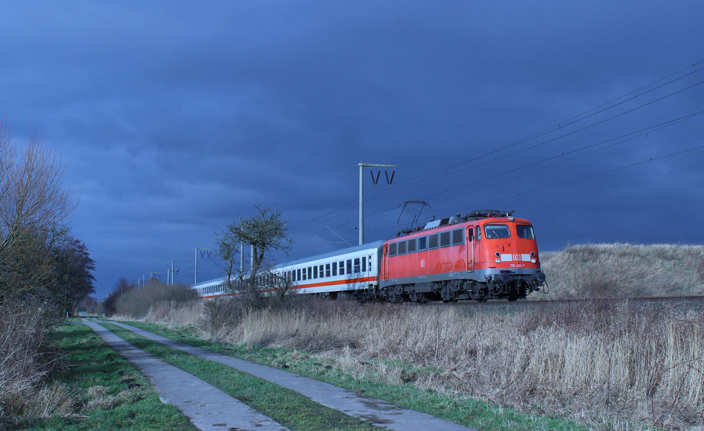 110 401-7 fuhr am 08.02.2013 mit dem IC 130 von Norddeich nach Koblenz, hier bei Veenhusen.