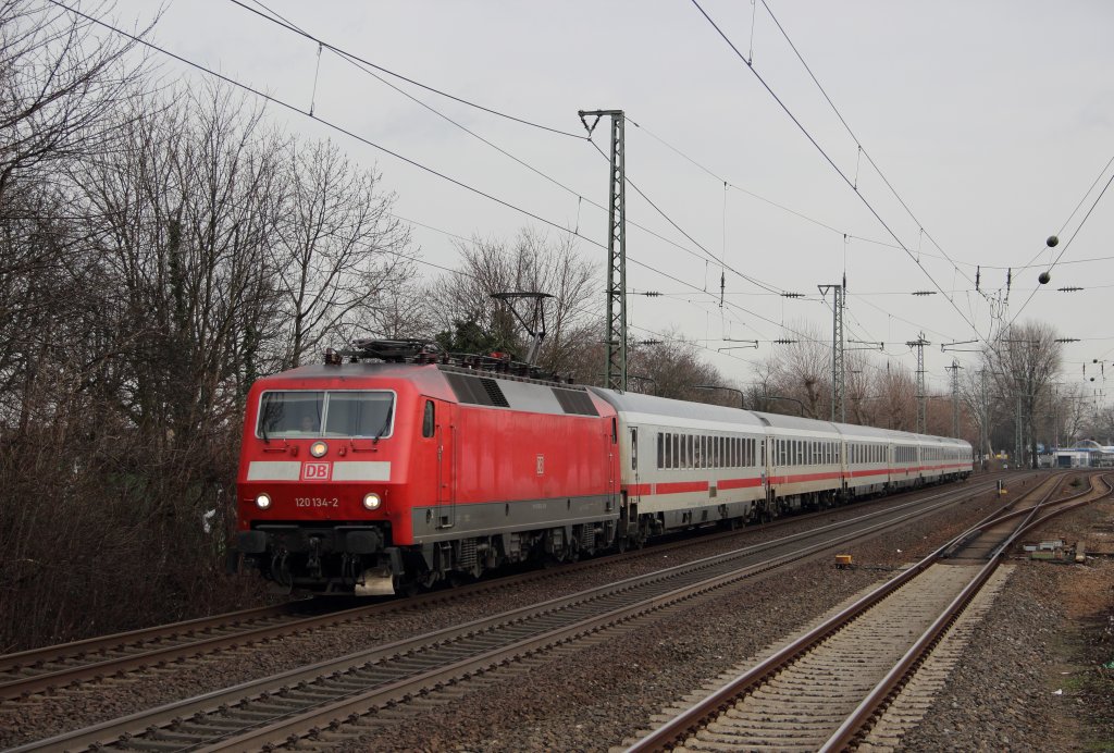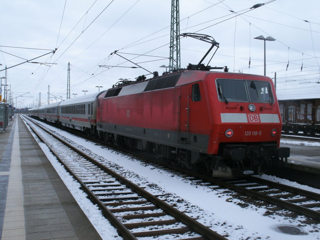Als Schublok war 120 118,am 07.Februar 2013,mit dem IC 2377 Binz-Frankfurt/Main Hbf,in Bergen/Rügen.