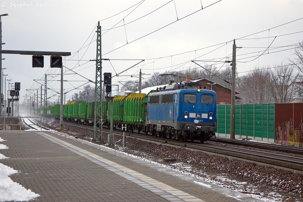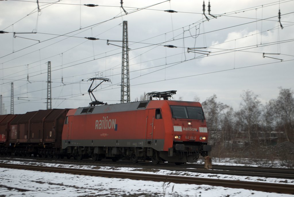 Hier 155 070-6 mit einem Schüttgutwagenzug, bei der Durchfahrt am 6.2.2013 durch Berlin Schönefeld Flughafen, in Richtung Berlin Grünauer Kreuz.