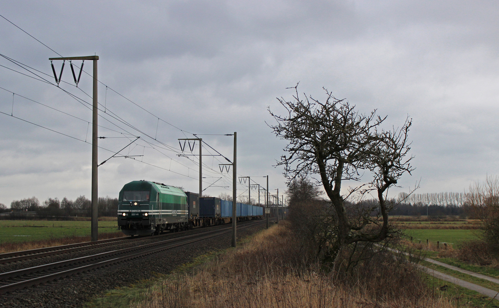 223 141 fuhr am 08.02.2013 mit einem Containerzug aus dem Süden nach Emden, hier bei Veenhusen.